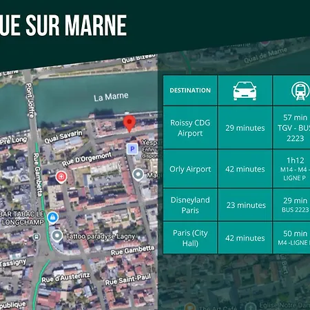 Cultural Park Rentilly ve Musee Municipal Gatien-Bonnet'a arabayla birkaç dakikada ulaşılabilir. Şehir merkezi daireden 1 km uzaklıktayken Paris-Charles de Gaulle Havalimani havalimanı 35 km mesafede bulunmaktadır. Le Cosy Lagny - Appartement Cosy Avec Balcon Vue Sur Marne dairesinin misafirleri, 6 km uzaklıkta bulunan Disneyland Park'ı ziyaret edebilirler.